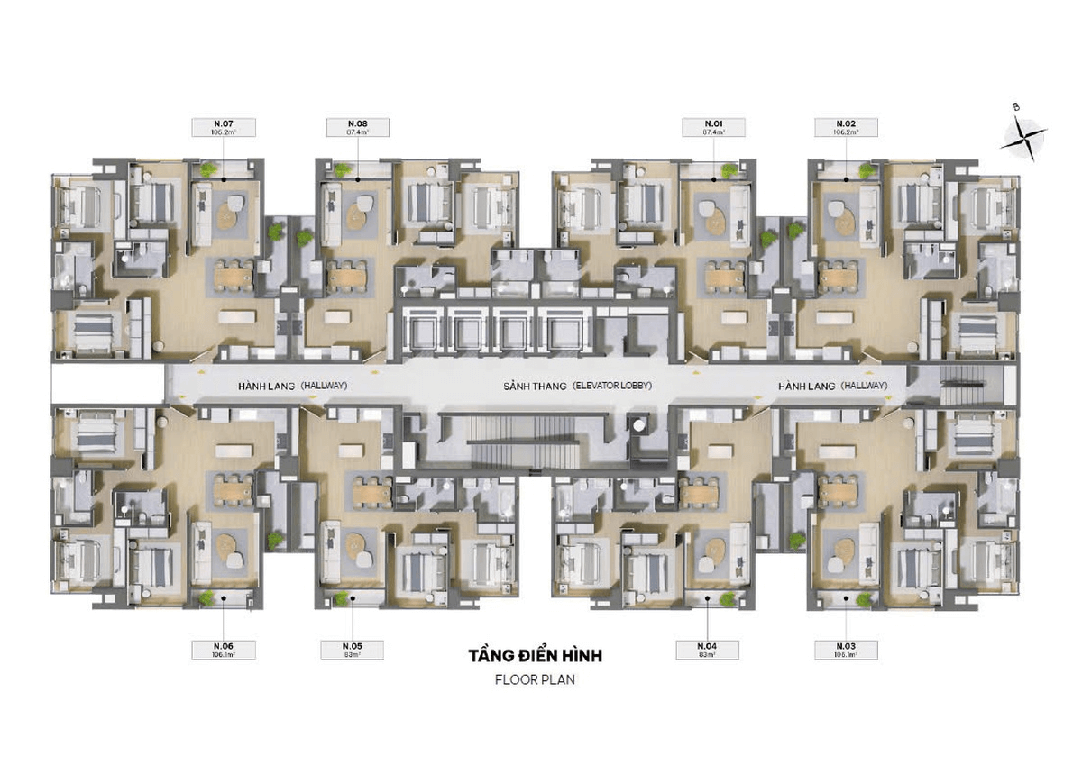 Một sàn có 4 căn hộ góc được thiết kế với diện tích 106.2m2 vuông vắn theo phong cách hiện đại tầm view vô cùng thoáng. Cả 3 phòng ngủ đều đón ánh sáng tự nhiên hứa hẹn đây sẽ là căn hộ vô cùng hot tại dự án